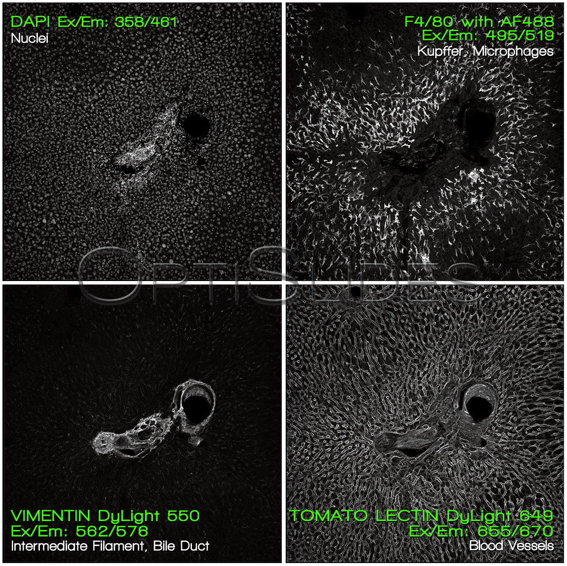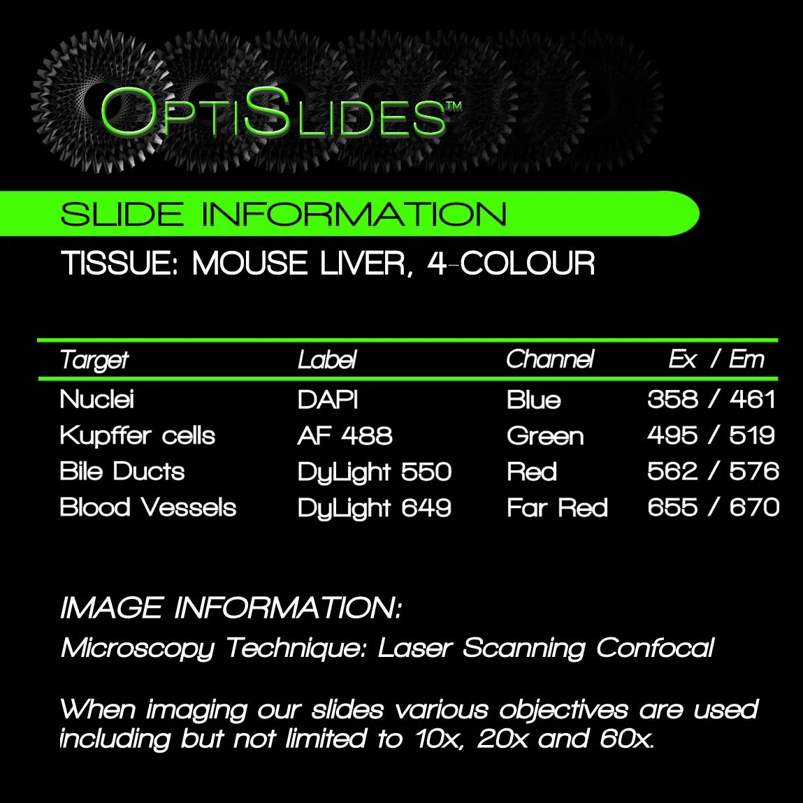 4 color prepared tissue slides are made to order. Specific targets proteins are subject to change. Allow additional time for delivery. Lymph Node and Testes are only available in 200 micron thickness.
