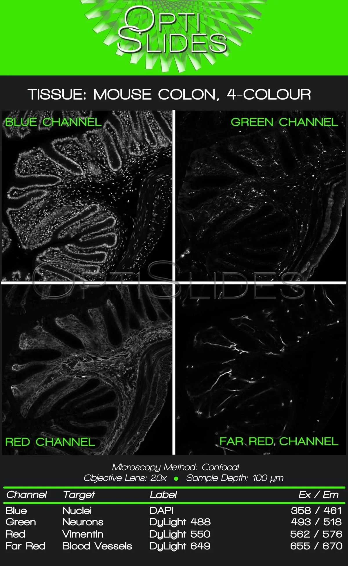 4-color images is pseudocolored: DAPI (Blue), PGP9.5 Neurons (Green), White blood cells (Magenta), and Blood vessels (Cyan). Image is a maximum projection from a laser scanning confocal using a 10x objective lens.
