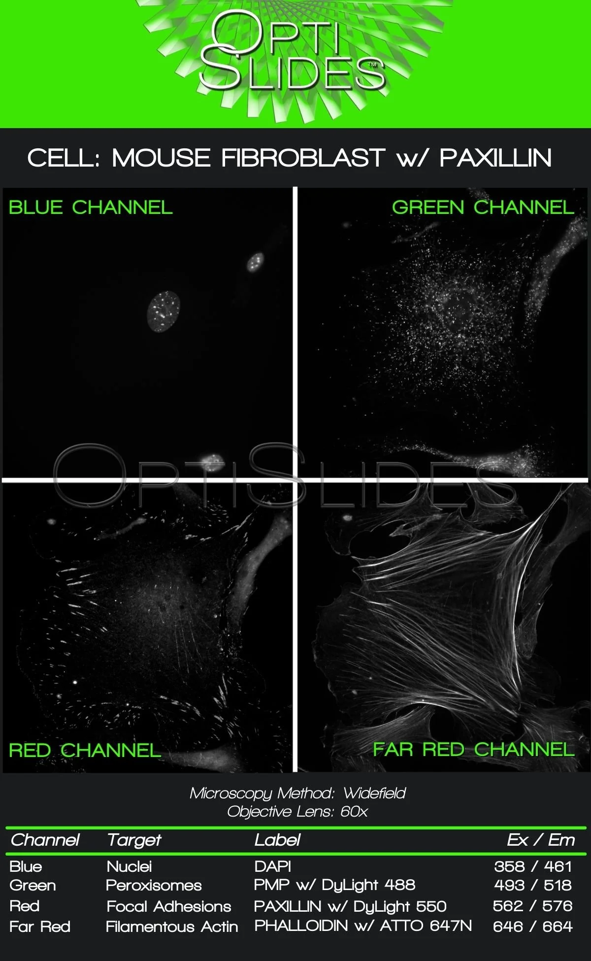 Slides are also stained for Peroxisomes, DAPI (nuclei) and Phalloidin (stress fibers)